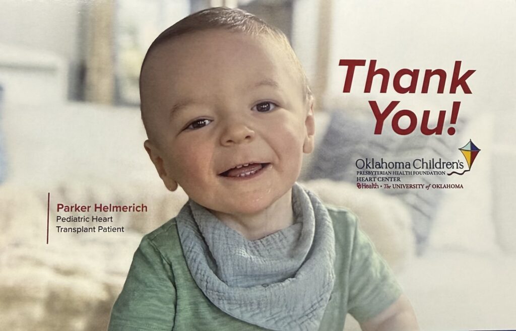 Born on December 11, 2023, in Tulsa, Parker Helmerich was diagnosed shortly after birth with critical pulmonary stenosis and cardiomyopathy — a severe congenital heart condition. Parker was transferred to Oklahoma Children’s OU Health in Oklahoma City, where he underwent multiple cardiac procedures and two open-heart surgeries.